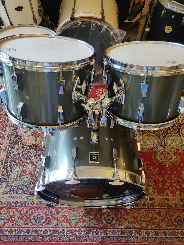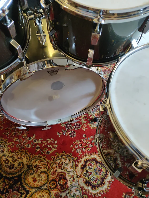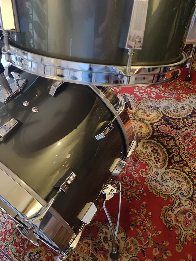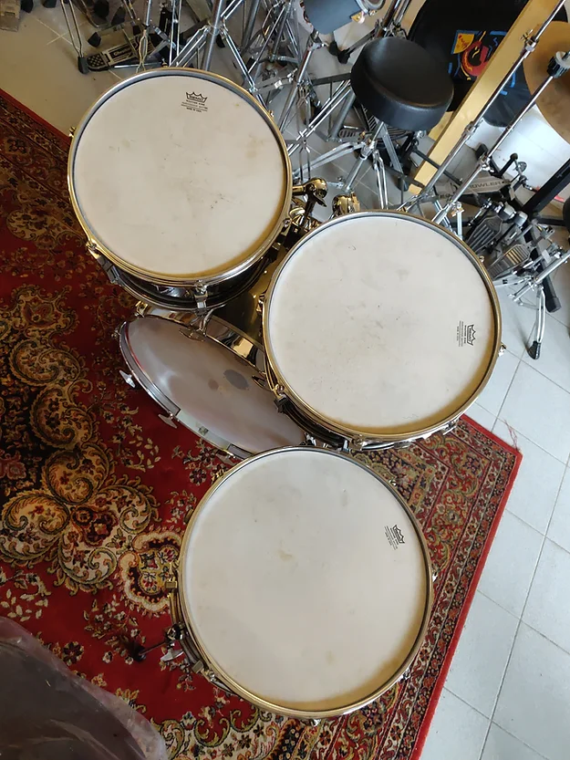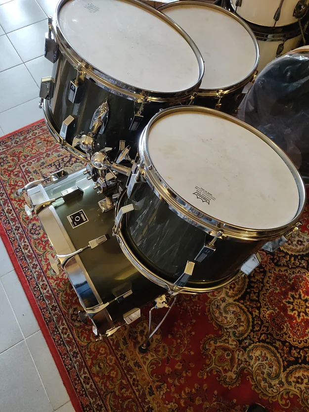 Set complet, état proche collection. Tout d’origine sauf un pied du tom bass et ses embouts. Une rayure sur le rhodo du 13″ (frottement caisse claire, voir photo)