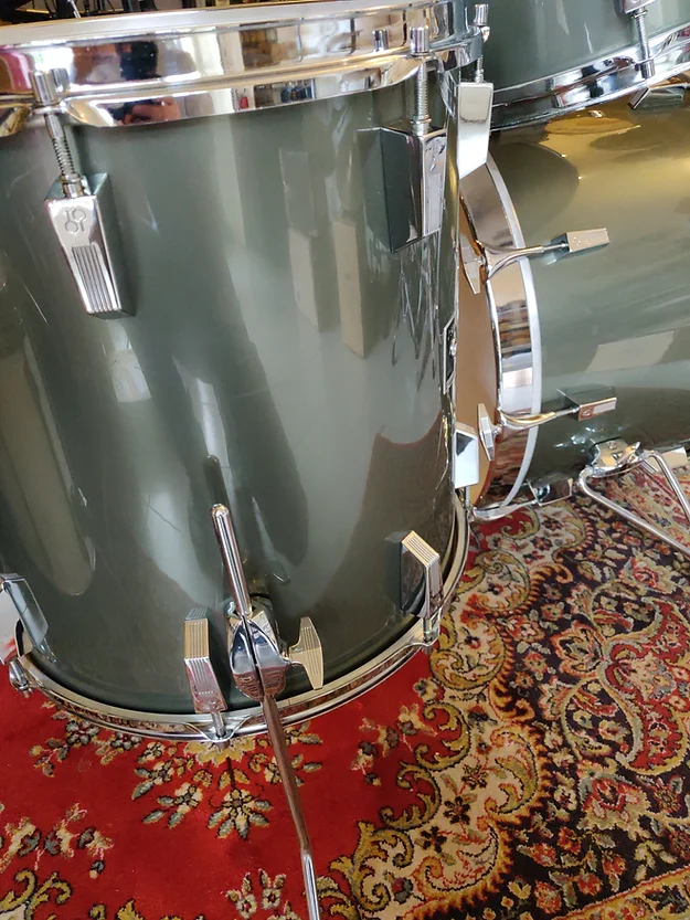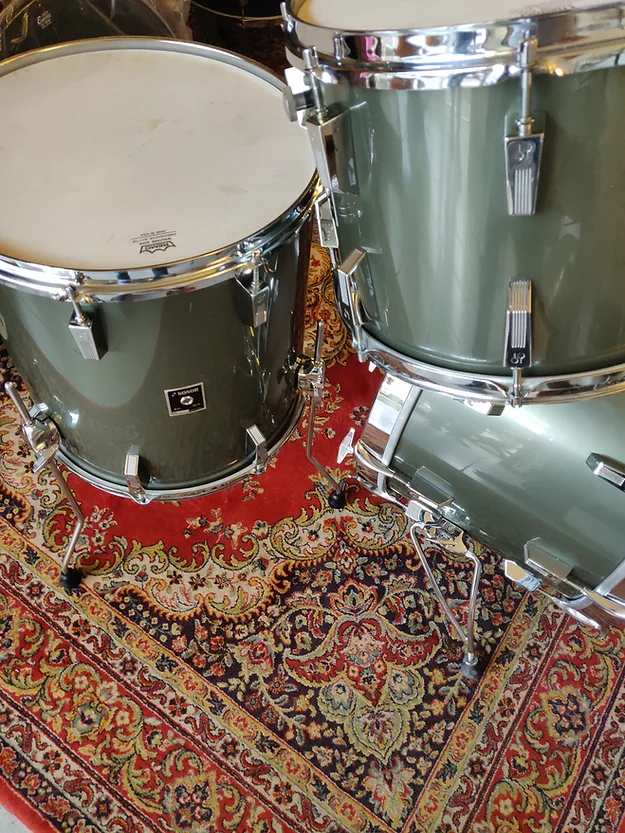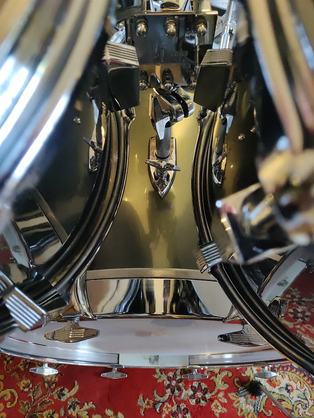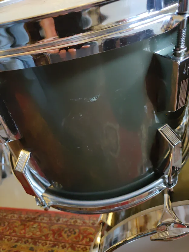 Drum set close to collector grade. All original except one FT leg and the 3 rubber tips. One noticeable scratch on the 13″ rhodoid (snare drum rubbing- see photo)
