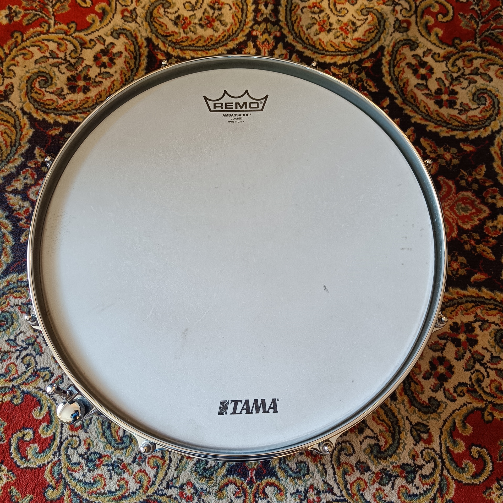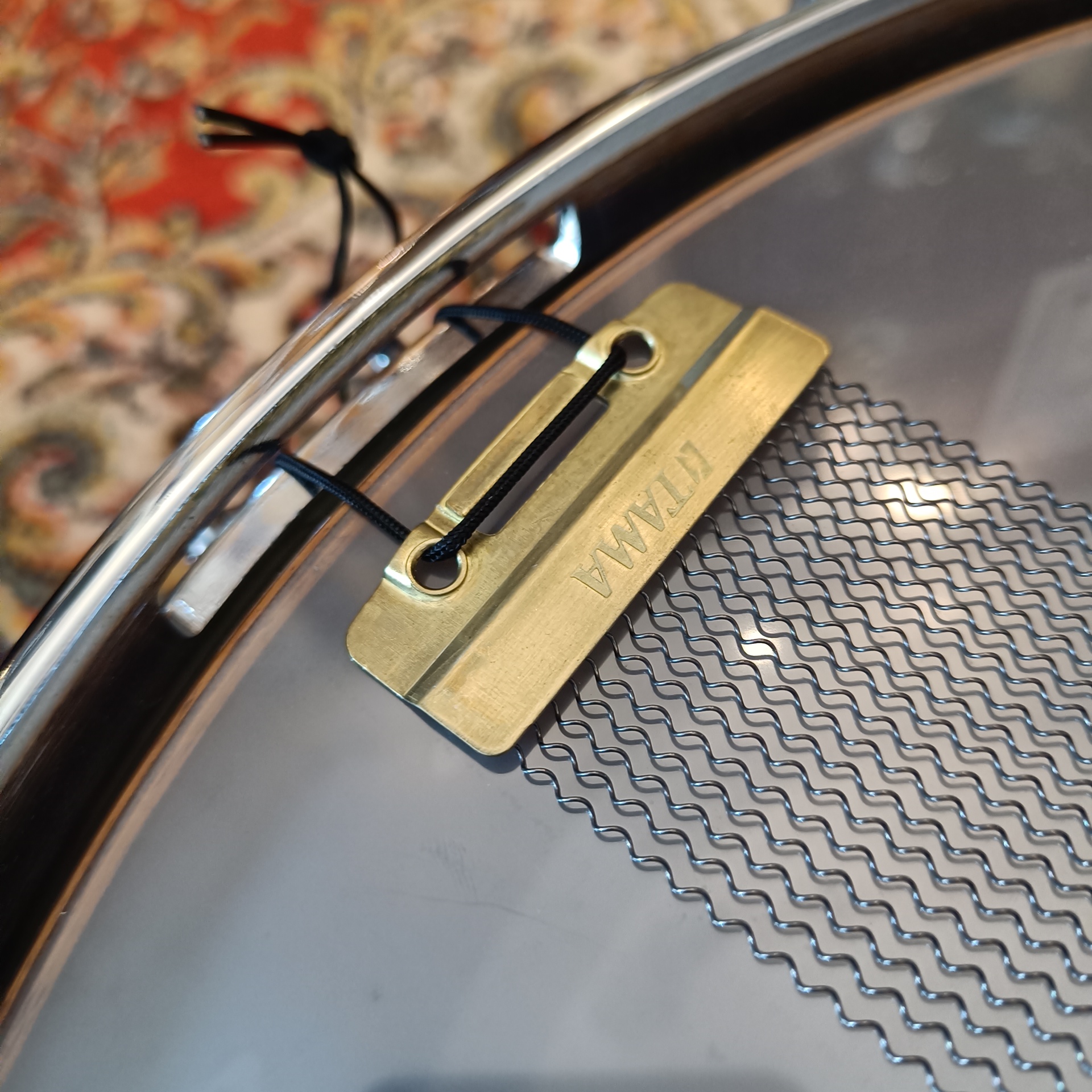 La caisse claire Tama Star Walnut 14″x5,5″ repose sur un fût composé de 6 plis de noyer (Walnut) pour une épaisseur totale de 6 mm. Contrairement aux modèles en érable ou en bouleau, le noyer possède une densité spécifique qui favorise une réponse riche en fréquences médiums-basses. En raison de sa structure moléculaire, ce bois offre une note fondamentale sombre et une chaleur organique très marquée. De plus, les fûts de la série Star bénéficient d’un tournage précis avec des chanfreins (bearing edges) dont le sommet est situé à 3,5 mm de la surface extérieure, optimisant ainsi le contact entre la peau et le bois.