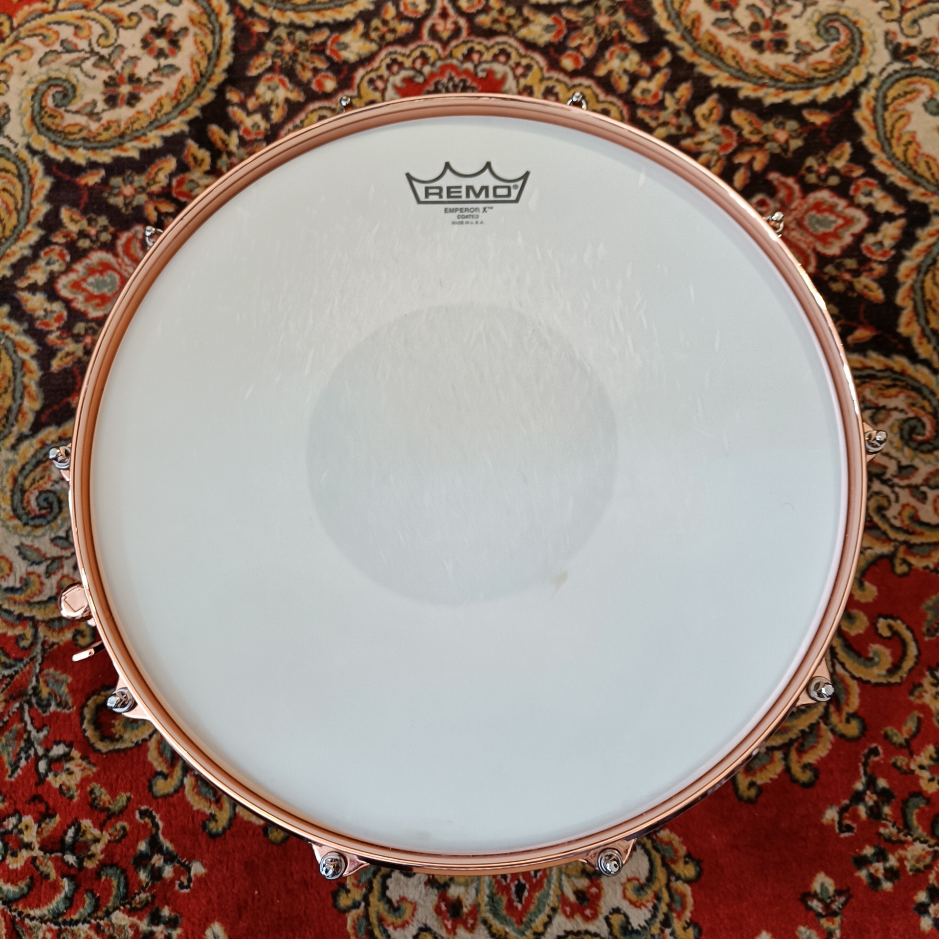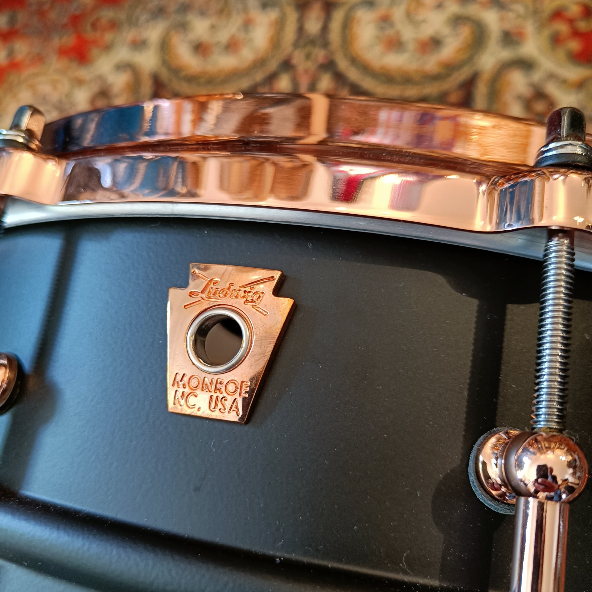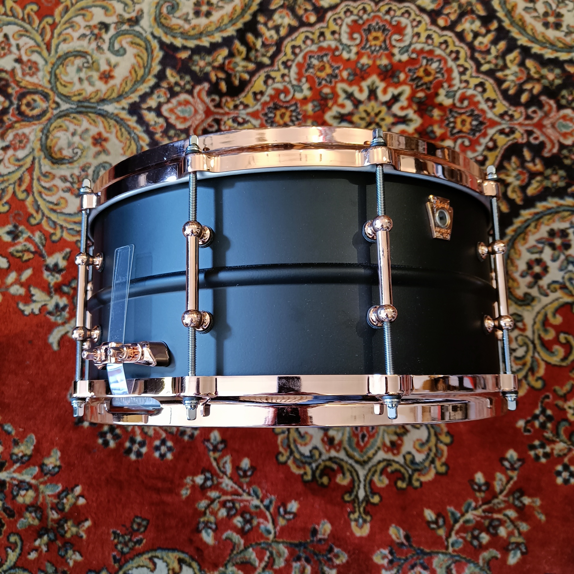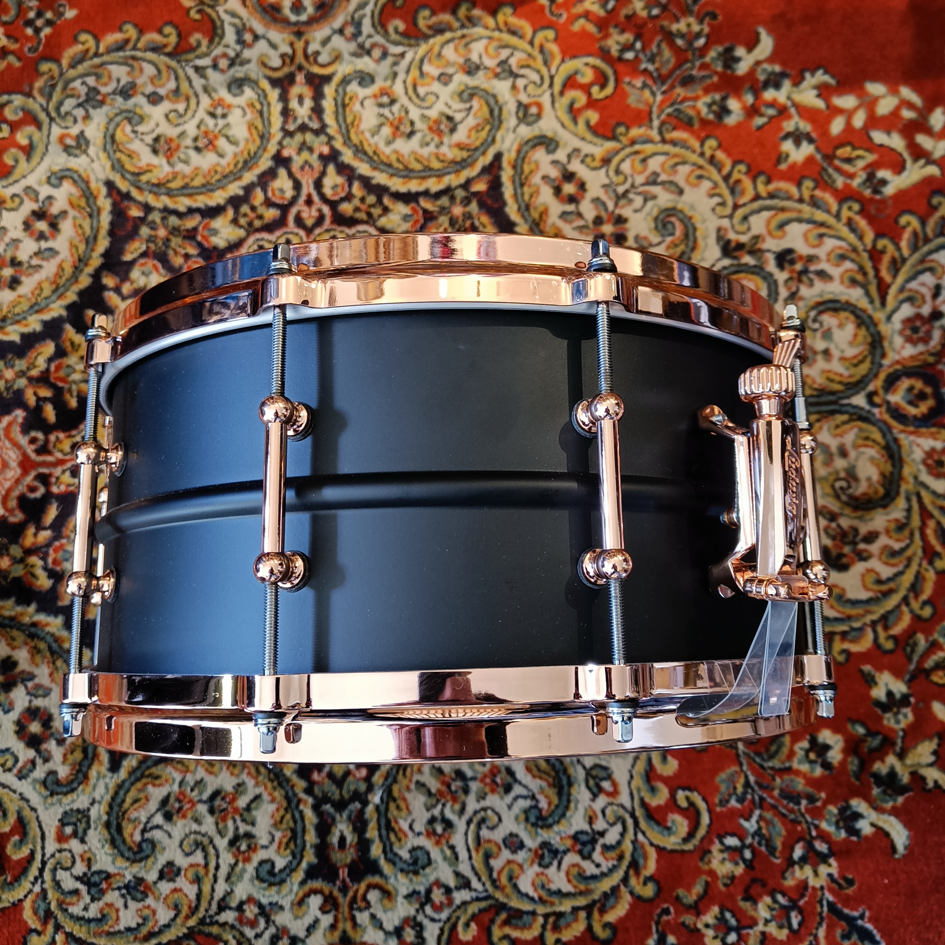 Accastillage : Accastillage copper, qui complète l’esthétique sombre de la caisse claire.